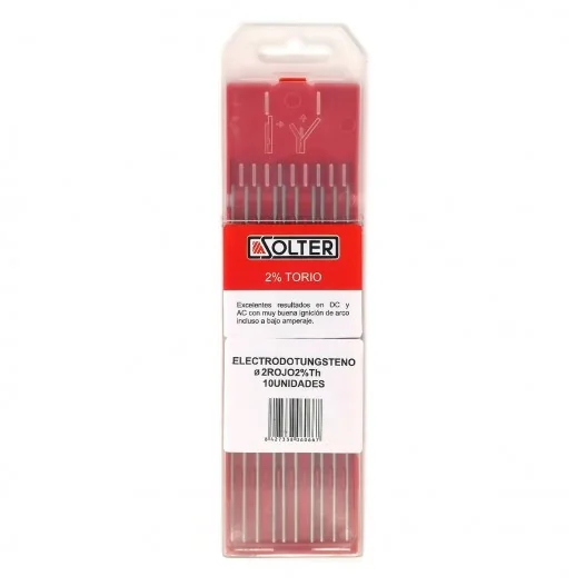 Electrodo de Tungsteno 2% Torio, color rojo Ø2mm. Se trata del electrodo mas comúnmente utilizado. Excelentes resultados en DC con muy buena ignición de arco incluso a bajo amperaje.
