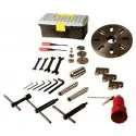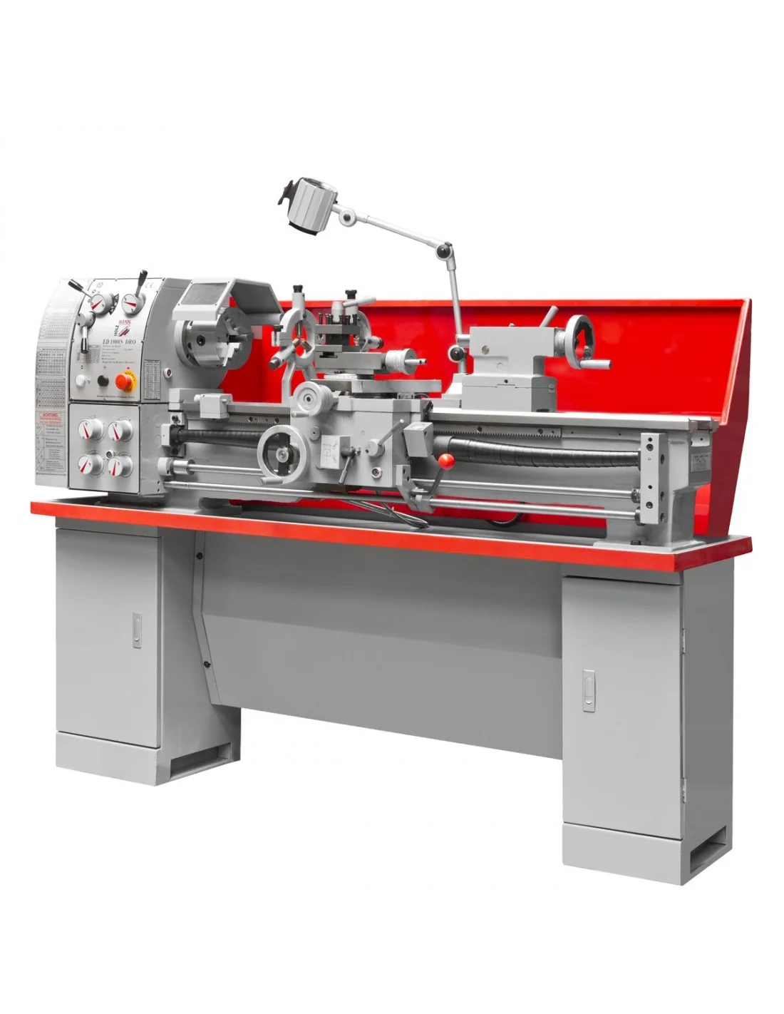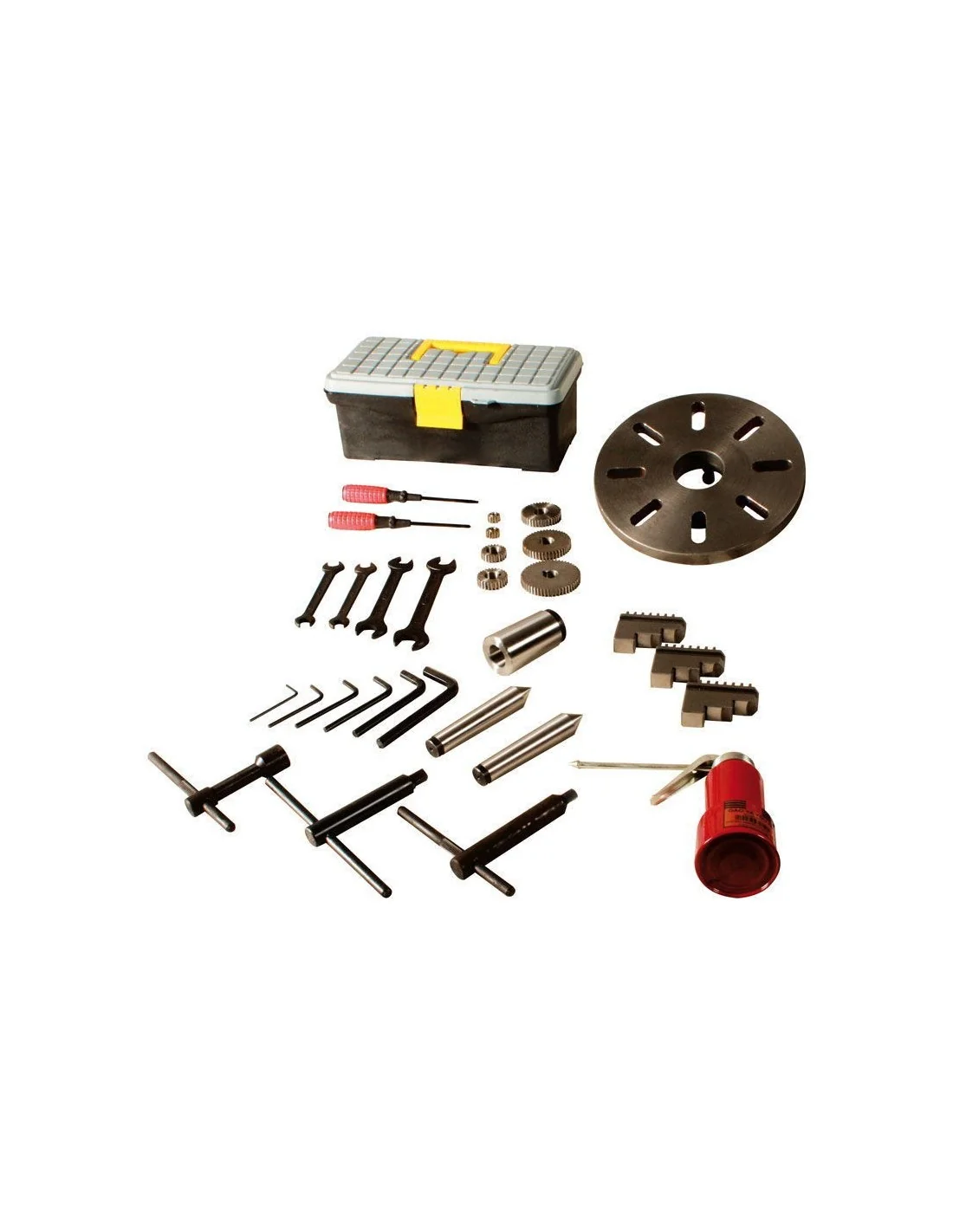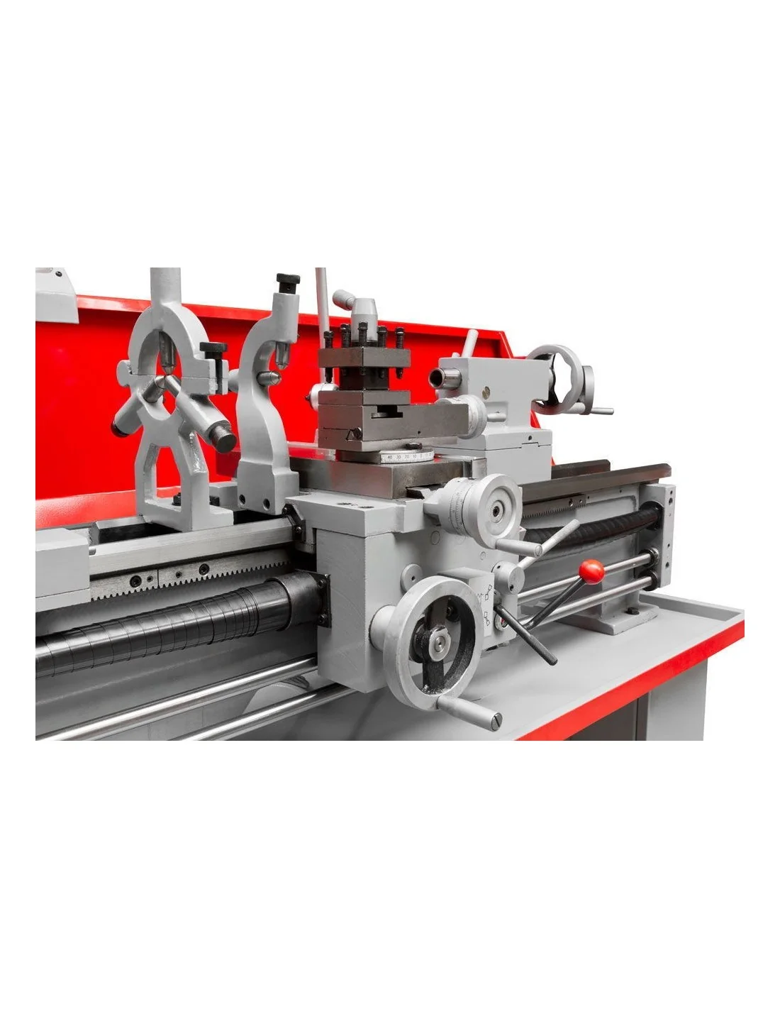 Material incluido: Plato de 3 garras Ø160mm, plato frontal, base metálica, luneta fija, luneta móvil, protector del eje, bandeja recoge virutas, 2 contrapuntos fijos MK3, reductor MK5/MK3, herramientas de servicio, lámpara, portaherramientas de 4 posiciones, juego de ruedas intercambiables.