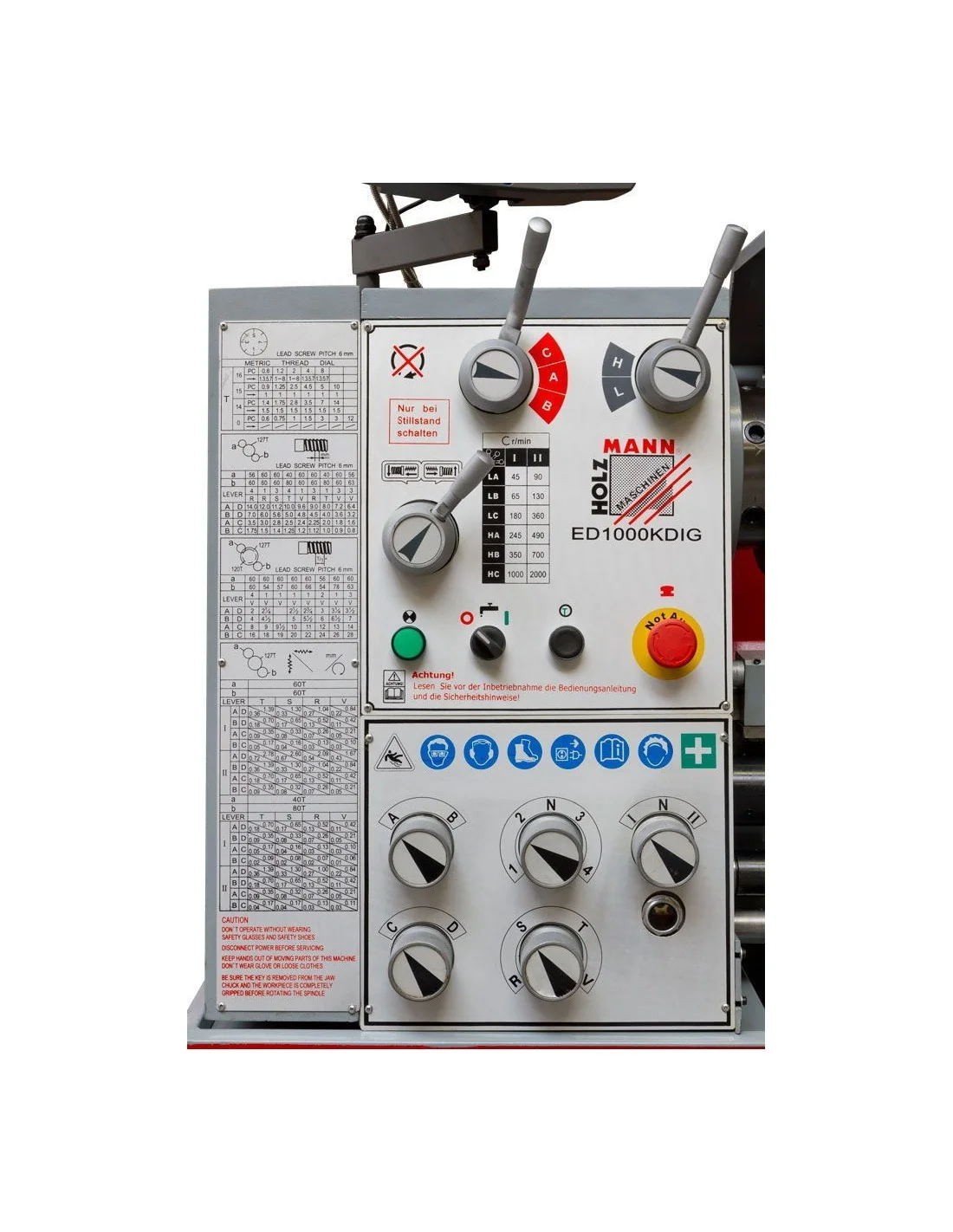 Material incluido: Posicionador digital de 3 ejes, plato de 3 garras Ø 200mm, plato de 4 garras Ø 200mm, plato del husillo Ø 250mm, 2x contrapuntos CM4, reducción CM 6/4, luneta fija, luneta móvil, lámpara halógena, bandeja posterior, sistema de refrigeración, freno electromecánico de pie, 1 Kit de piñones, herramientas de montaje