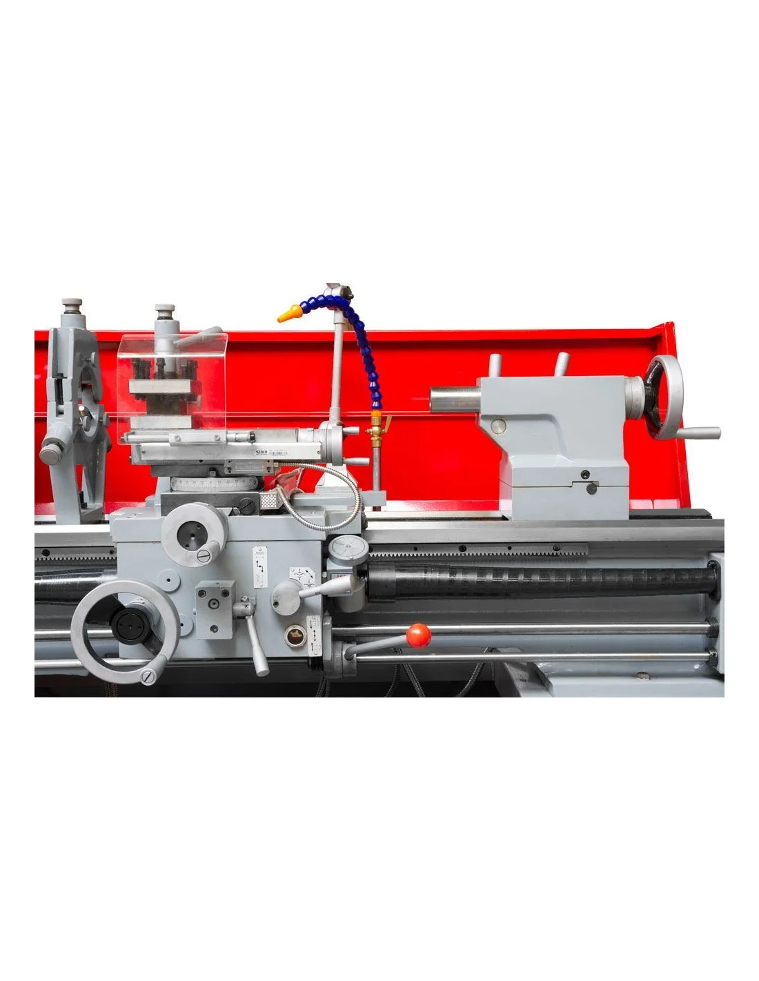 - Equipado con protección trasera metálica, que minimiza la proyección de virutas y salpicaduras de fluido de corte durante el mecanizado.