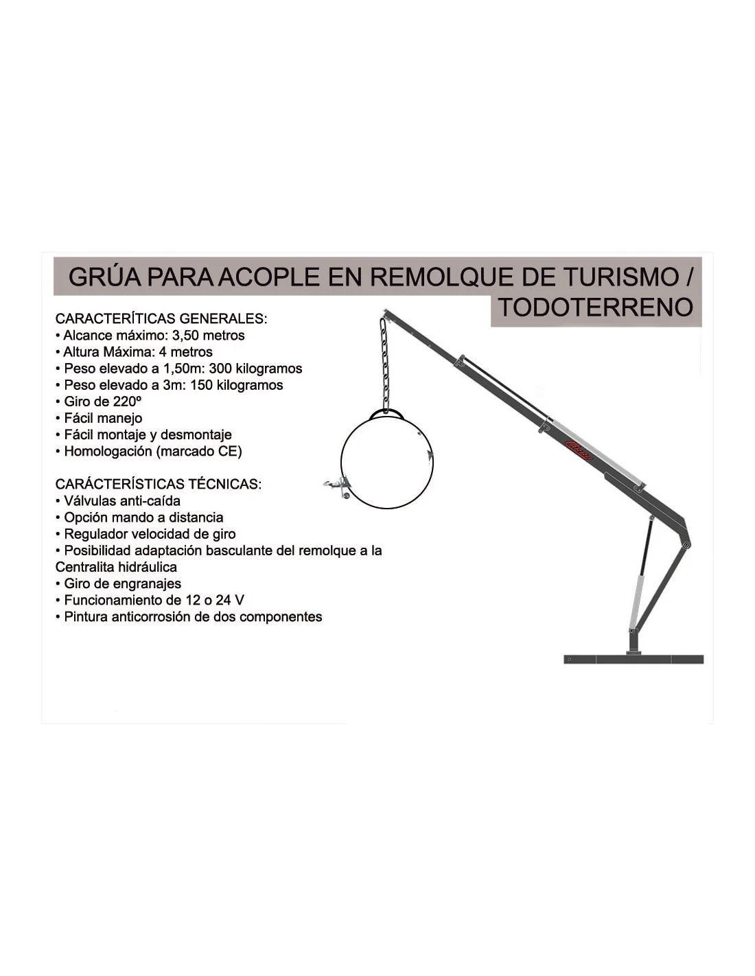 Pluma Grua Hidráulica giro 220º con bomba eléctrica y mando inalámbrico - Homologada CE