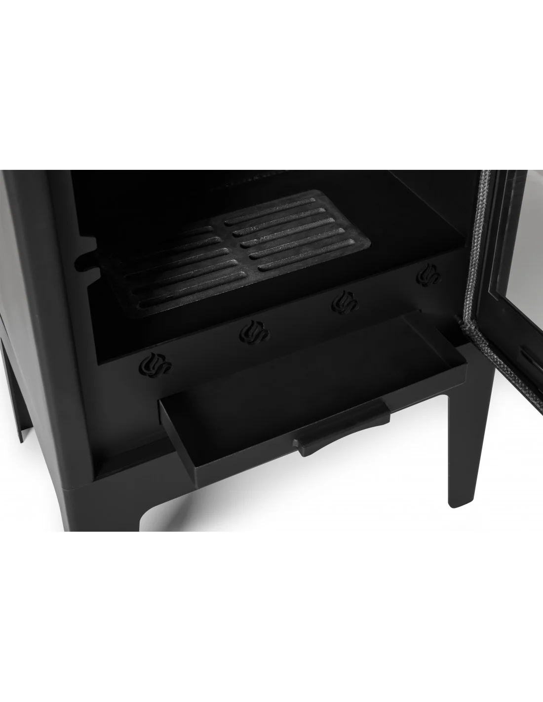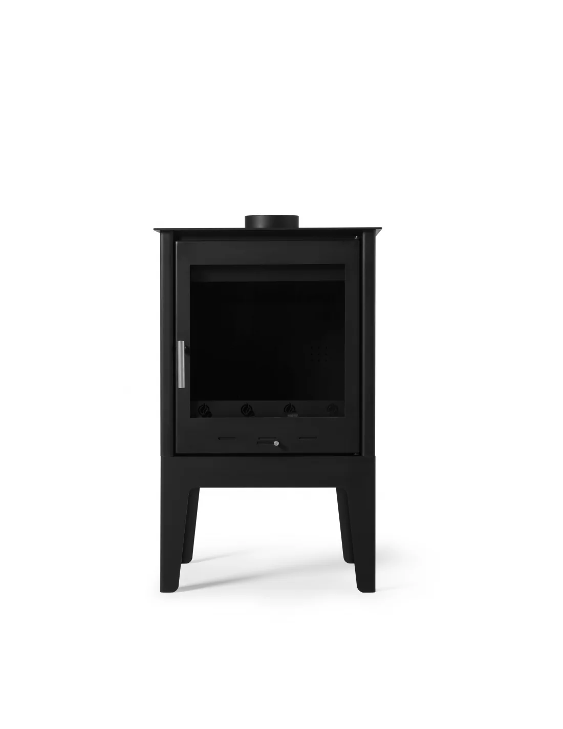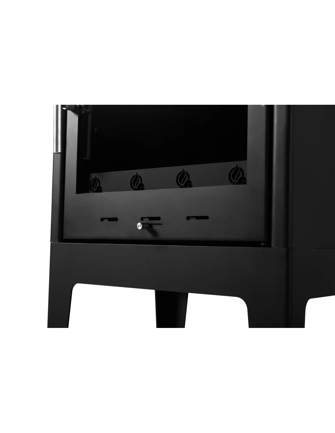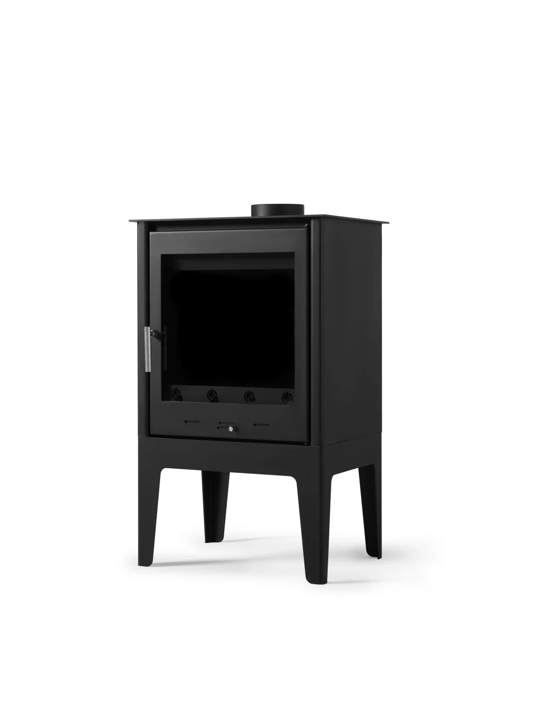La estufa Formentera es una estufa de diseño contemporáneo y funcional. Está construida en chapa de acero de color negro y tiene una puerta frontal de vidrio que permite visualizar el fuego en su interior. La estructura de la estufa es cuadrada y se apoya sobre cuatro patas robustas que le proporcionan estabilidad y una apariencia elegante. En la parte superior cuenta con una salida de humo para la correcta ventilación. El diseño de la estufa Formentera combina líneas simples y modernas, lo que la hace adecuada para una variedad de estilos de interiores, desde rústicos hasta modernos.