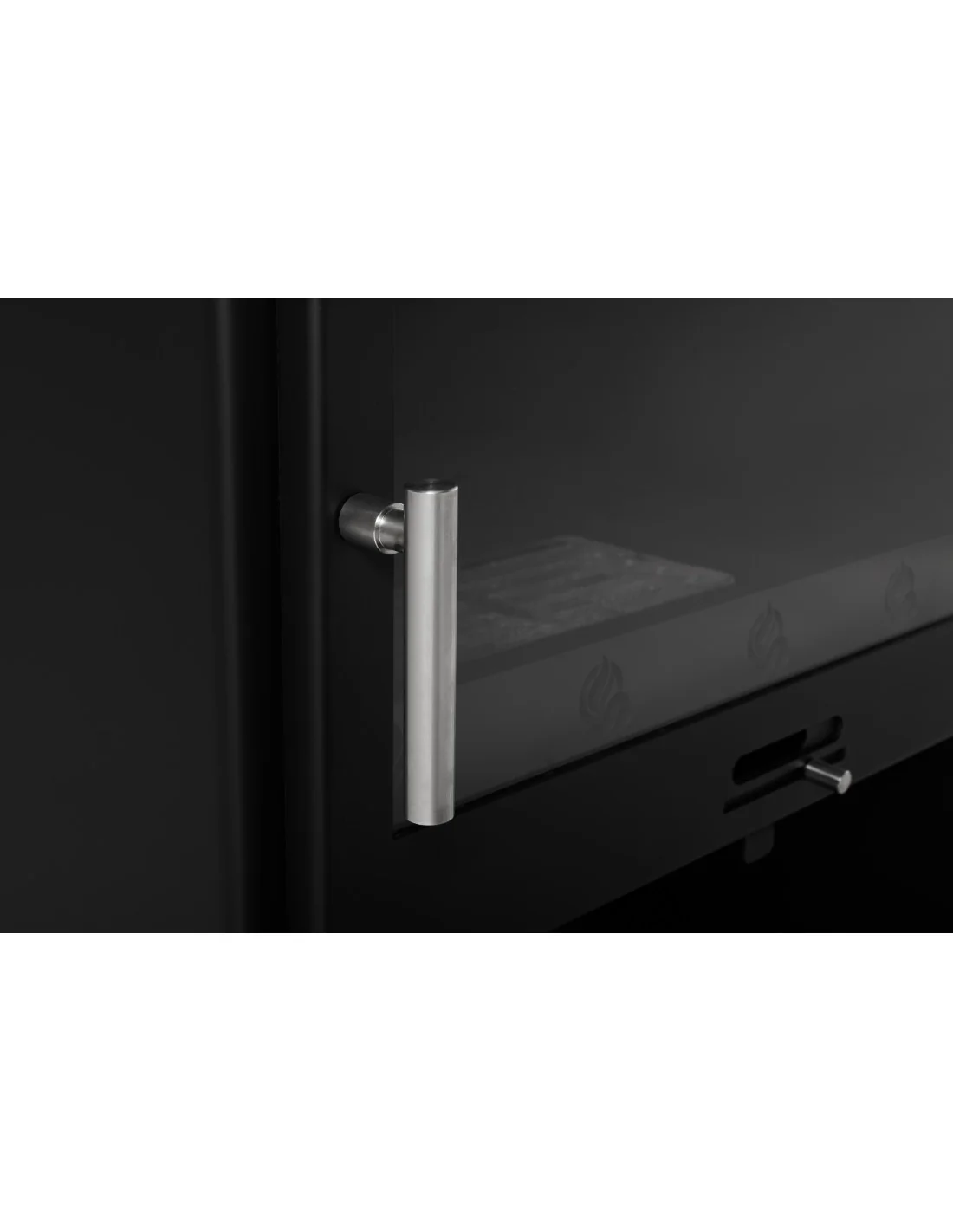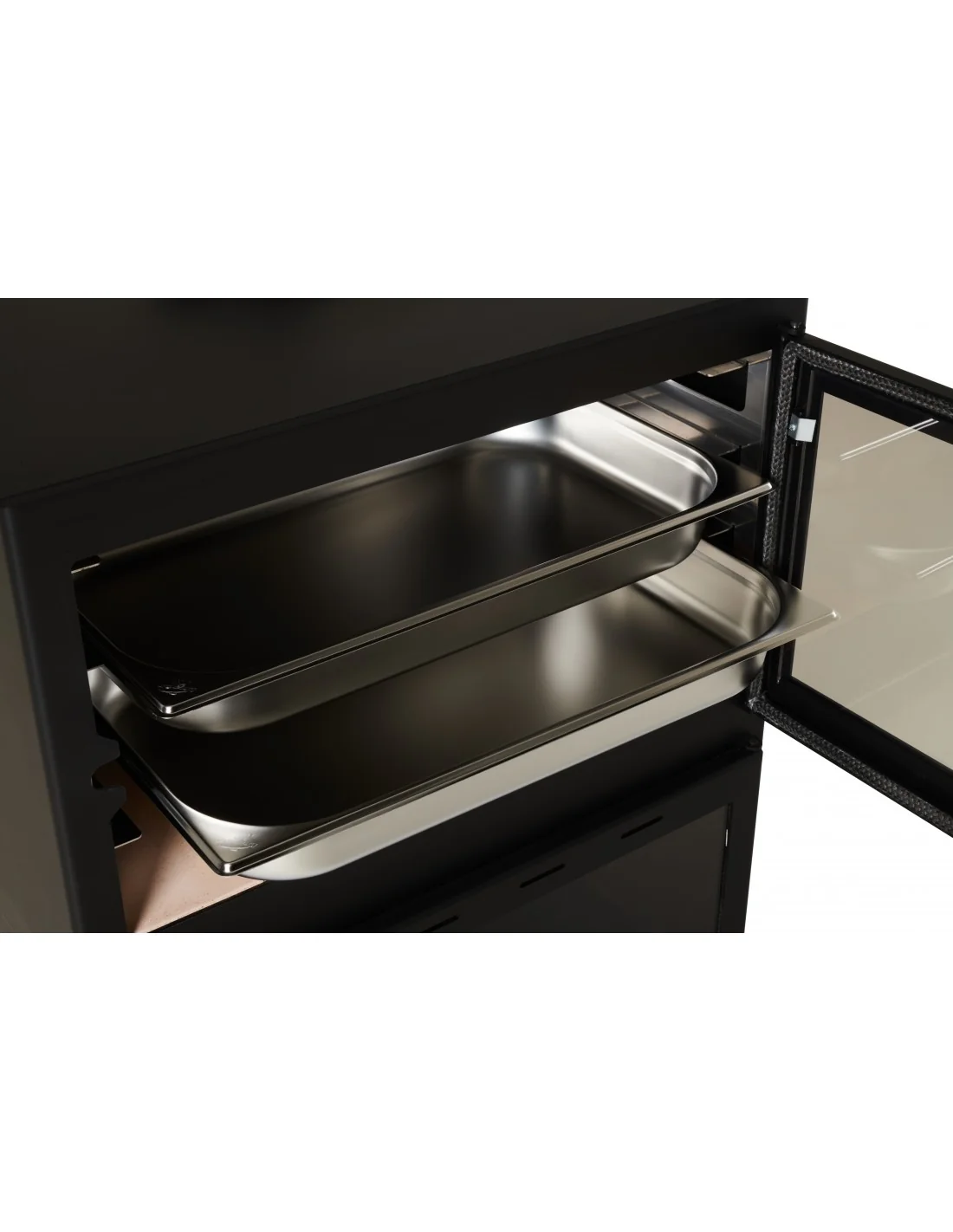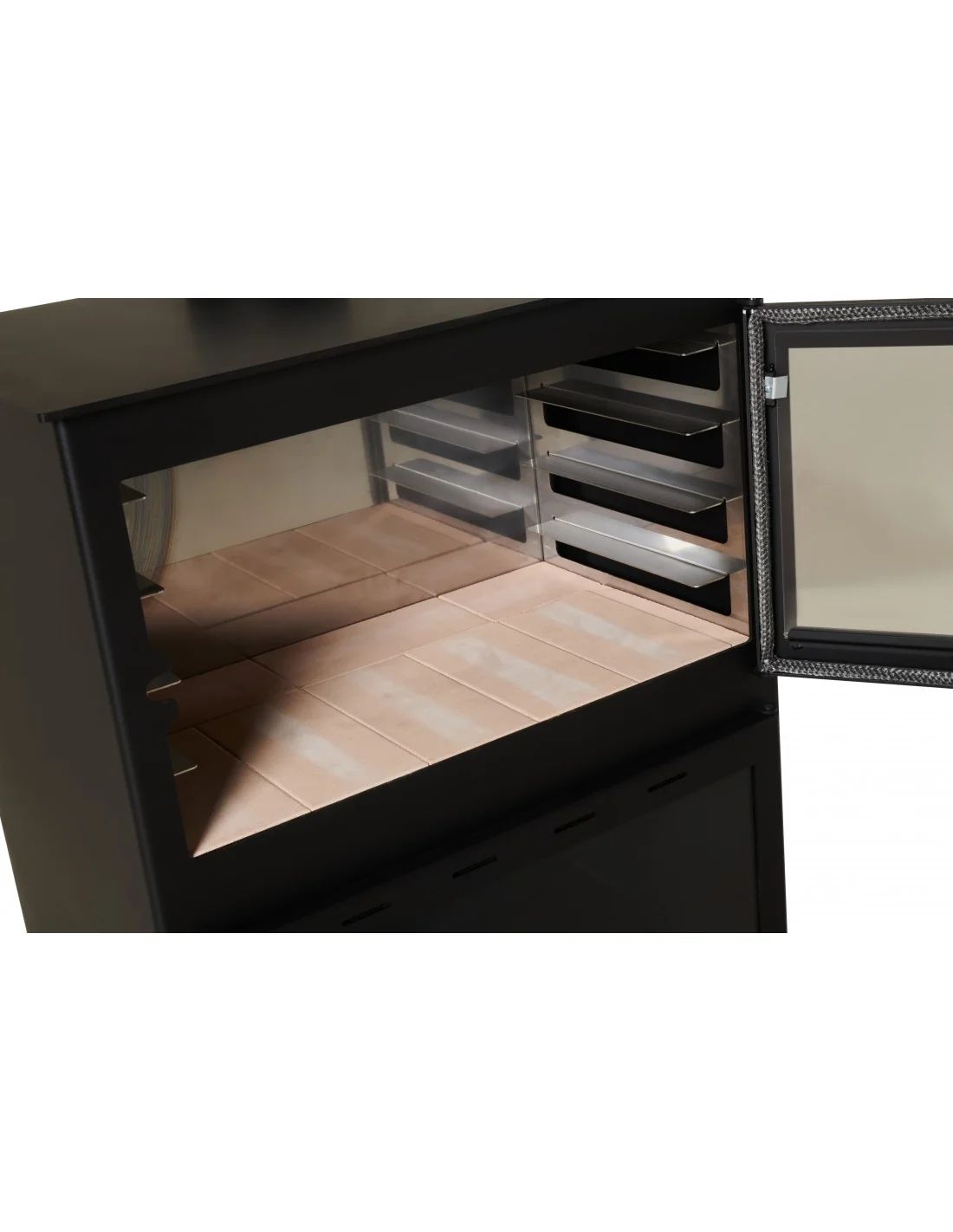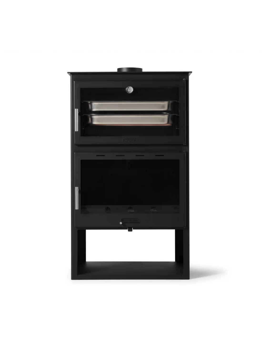 La estufa Grosa 2 es una estufa de diseño contemporáneo y funcional. Está construido en chapa de acero de 4mm de color negro y tiene una puerta frontal de vidrio que permite visualizar el fuego en su interior. Cuenta con un horno muy amplio. La estructura es rectangular y se apoya sobre una base rectangular hueca, que le proporciona estabilidad y un diseño elegante para almacenar leña . En la parte superior cuenta con una salida de humo para la correcta ventilación. El diseño de la estufa Grosa 2 combina líneas simples y modernas, lo que la hace adecuada para una variedad de estilos de interiores, desde rústicos hasta modernos.