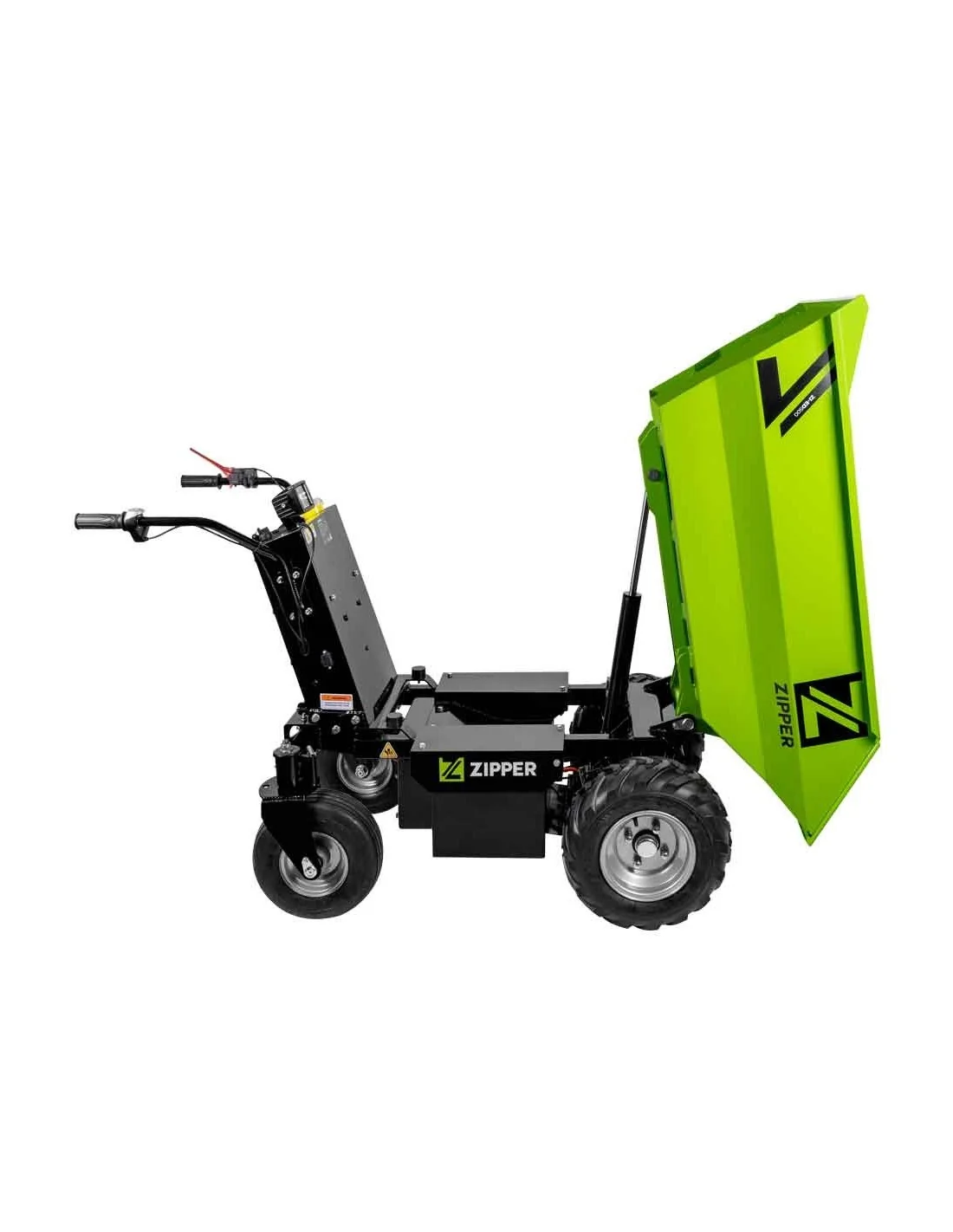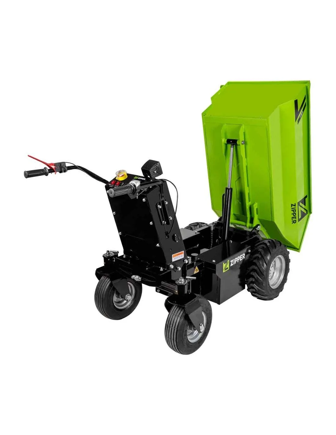 El MINIDUMPER sobre ruedas eléctrico ZIPPER ZI-ED500 con caja basculante hidráulica, es el perfecto ayudante para el transporte de mercancías a granel hasta 500kg. Silencioso, sin gases de escape, es ideal para uso en interiores de obras, invernaderos, etc. De dimensiones compactas, puede pasar también a través de puertas dentro de las obras y por caminos estrechos.