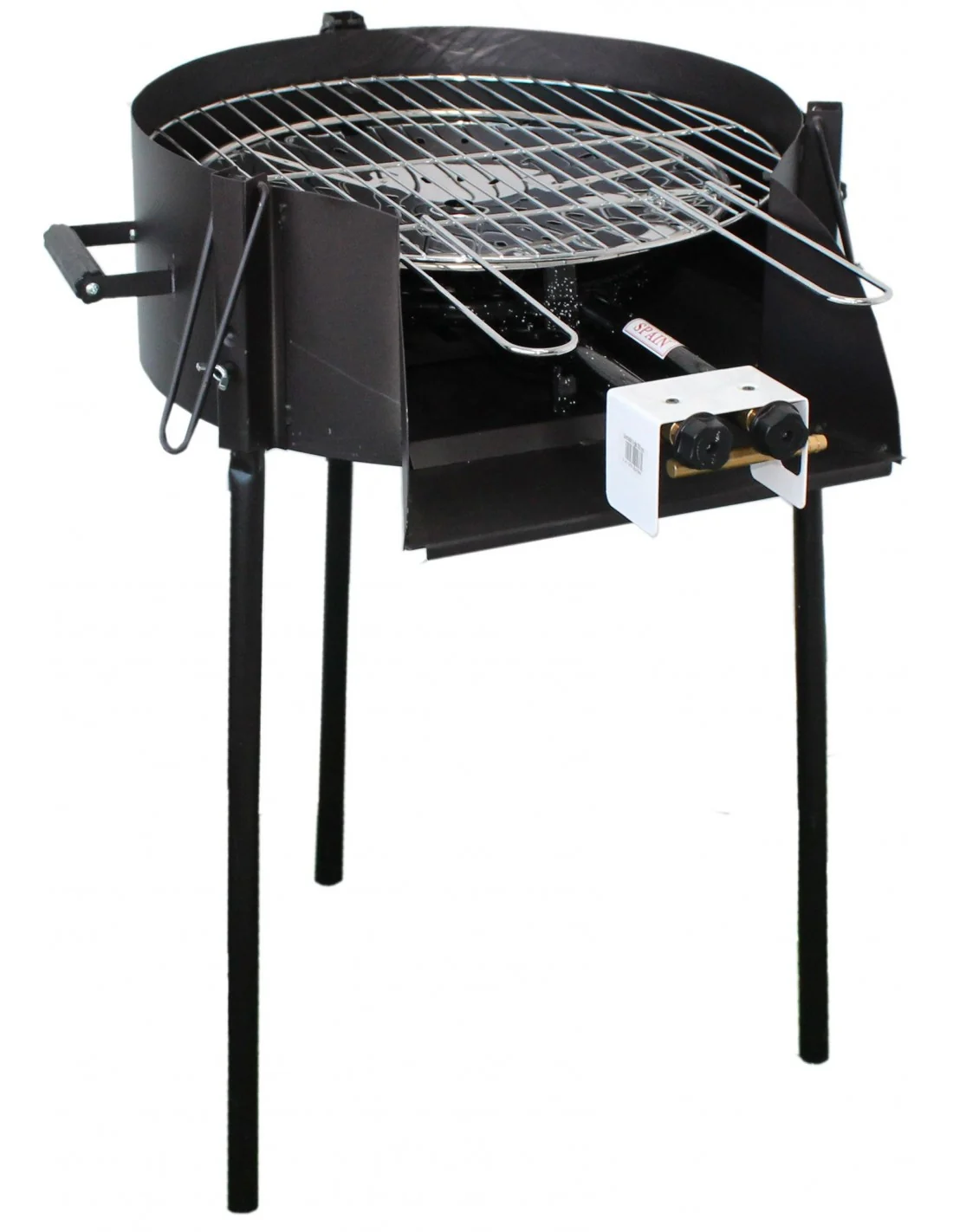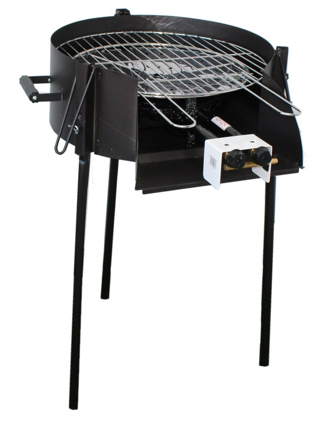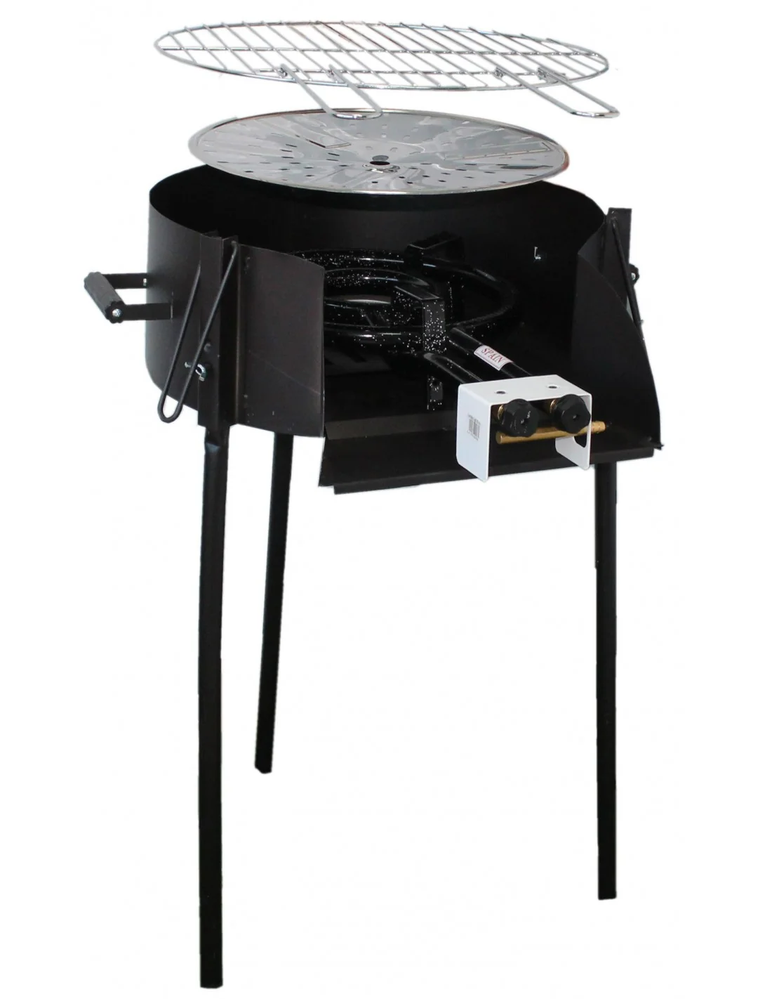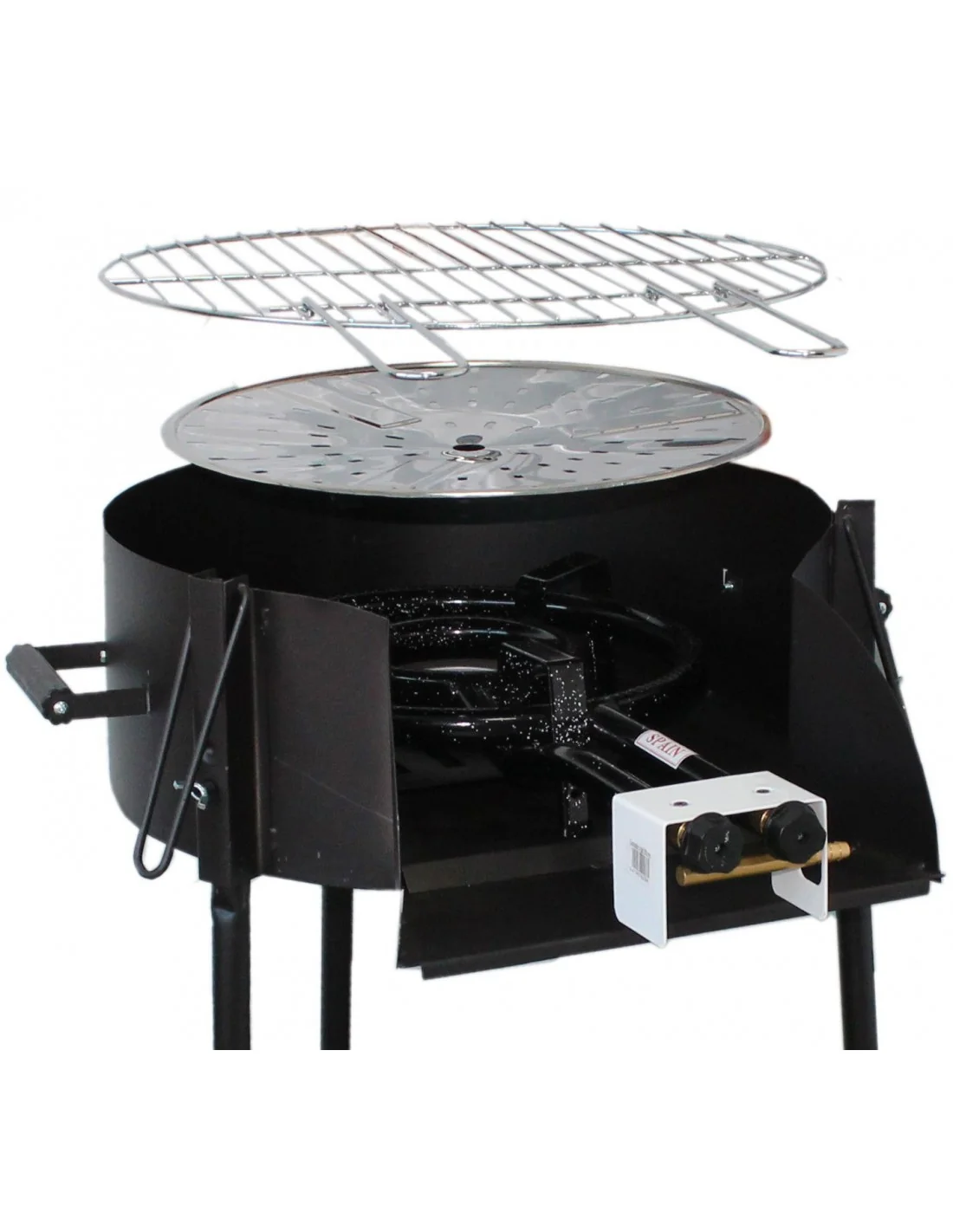 Barbacoa circular de jardín con parrilla de carbón o leña con 3 funciones modelo ALGO MAS de IMOR®.Las dimensiones de la barbacoa son 50 cm de diámetro x 81,5 cm de alto.La medida del asador es de 60 cm de diámetro x 19 cm de alto, con un ingreso a la parrilla de 37 cm de ancho.Incluye los siguientes accesorios:Parrilla.ProtectorRosco de gas.El peso es de 11 Kg.